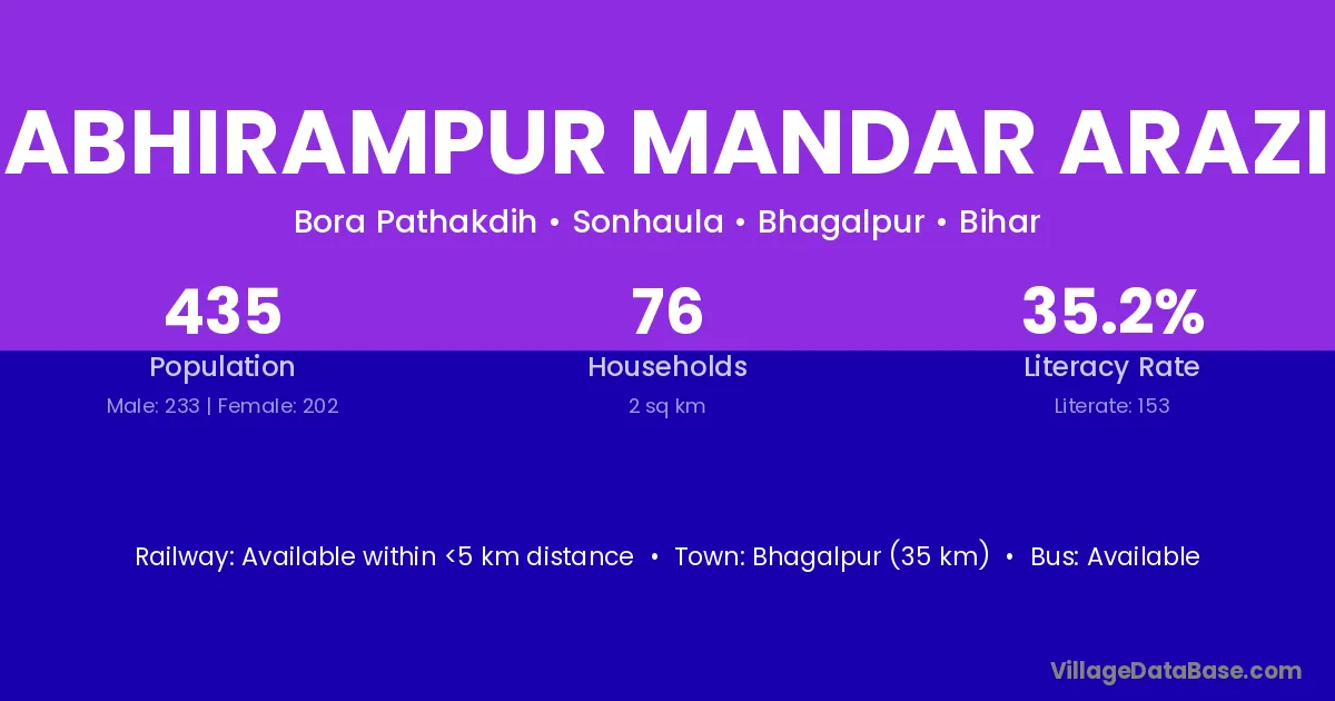 Bhagalpur (35 km) is the nearest town to Abhirampur Mandar Arazi village for major economic activities and is located approximately 35 km away.