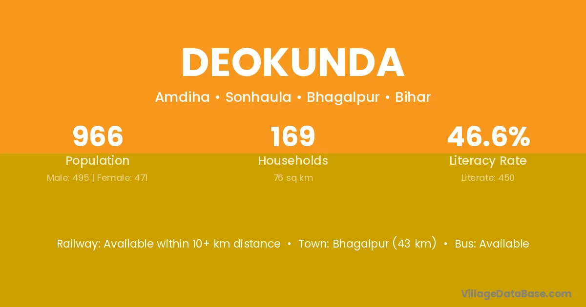 Bhagalpur (43 km) is the nearest town to Deokunda village for major economic activities and is located approximately 43 km away.