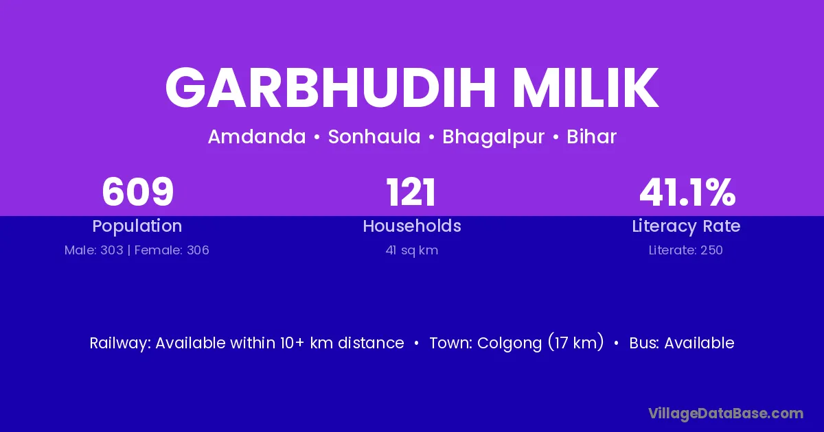 Colgong (17 km) is the nearest town to Garbhudih Milik village for major economic activities and is located approximately 17 km away.