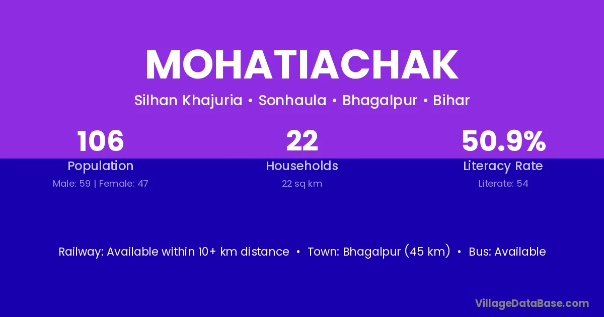 Bhagalpur (45 km) is the nearest town to Mohatiachak village for major economic activities and is located approximately 45 km away.