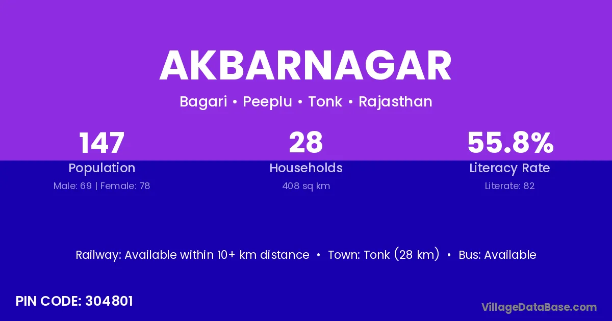 The literacy rate of Akbarnagar village is 56.71%. Male literacy stands at 62.94% and female literacy at 49.74%.