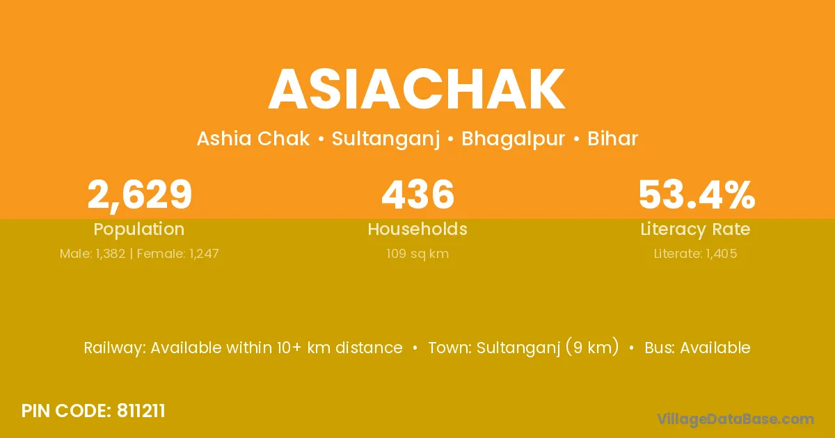 Sultanganj (9 km) is the nearest town to Asiachak village for major economic activities and is located approximately 9 km away.
