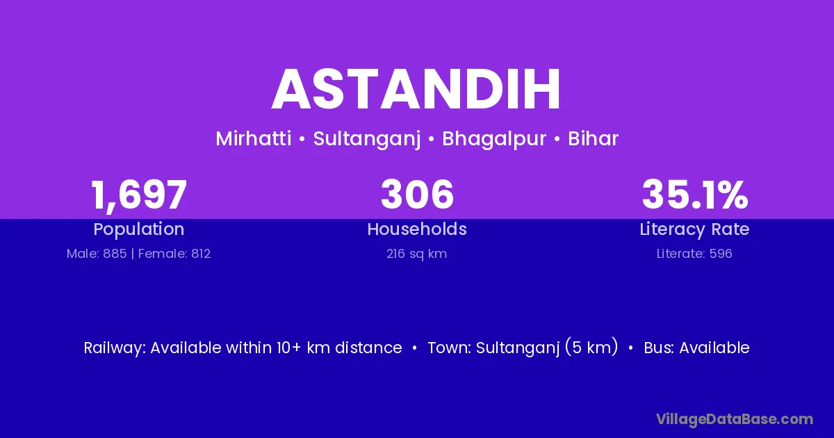 Sultanganj (5 km) is the nearest town to Astandih village for major economic activities and is located approximately 5 km away.