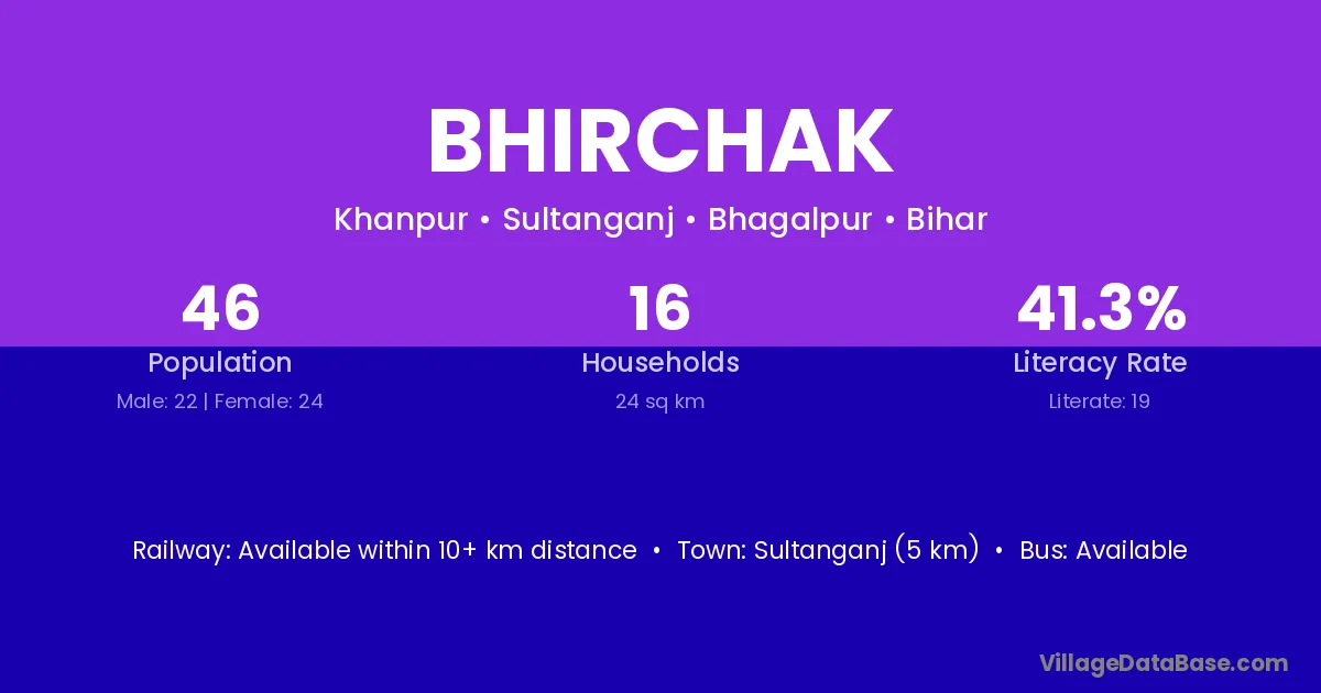 Sultanganj (5 km) is the nearest town to Bhirchak village for major economic activities and is located approximately 5 km away.