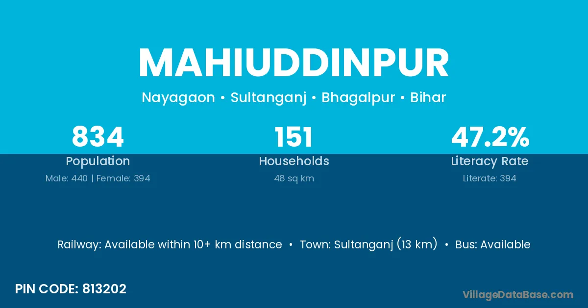 Sultanganj (13 km) is the nearest town to Mahiuddinpur village for major economic activities and is located approximately 13 km away.