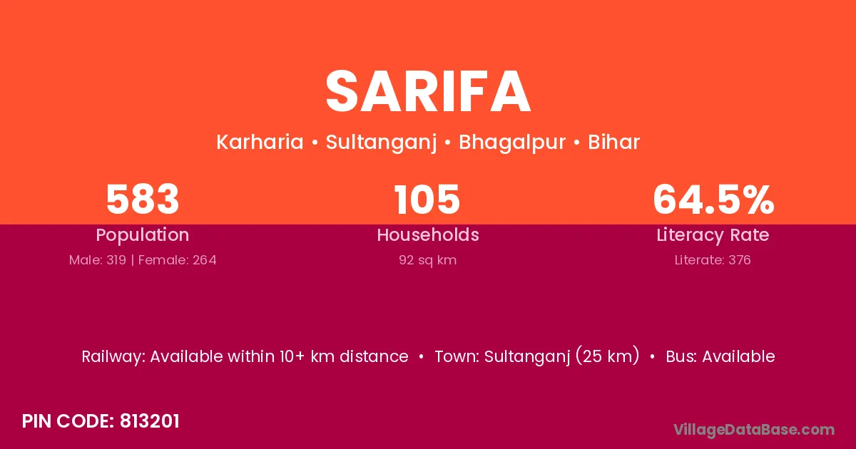 Sultanganj (25 km) is the nearest town to Sarifa village for major economic activities and is located approximately 25 km away.