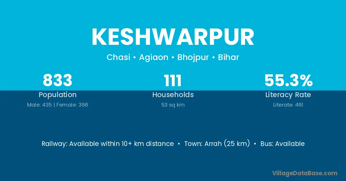 Arrah (25 km) is the nearest town to Keshwarpur village for major economic activities and is located approximately 25 km away.