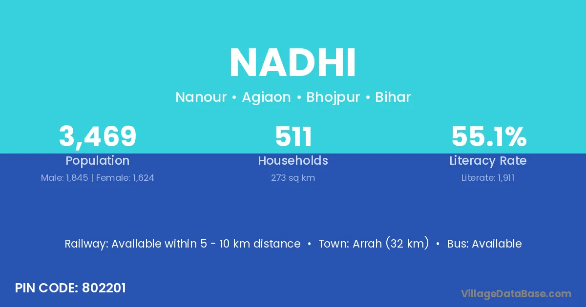 Arrah (32 km) is the nearest town to Nadhi village for major economic activities and is located approximately 32 km away.