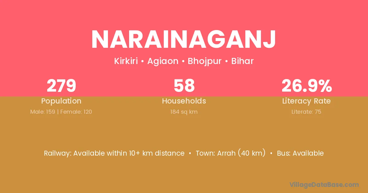 Arrah (40 km) is the nearest town to Narainaganj village for major economic activities and is located approximately 40 km away.