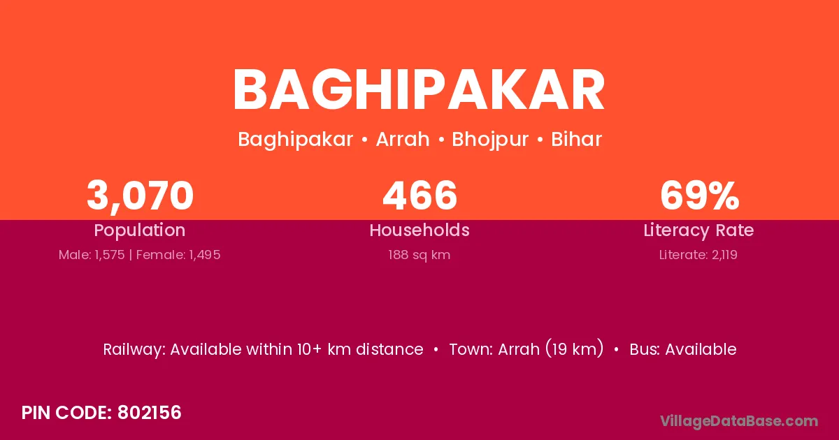 Arrah (19 km) is the nearest town to Baghipakar village for major economic activities and is located approximately 19 km away.