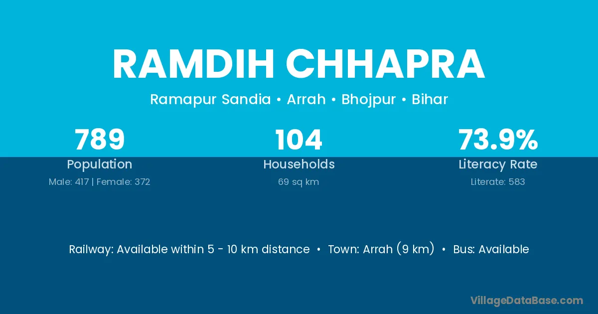 Arrah (9 km) is the nearest town to Ramdih Chhapra village for major economic activities and is located approximately 9 km away.