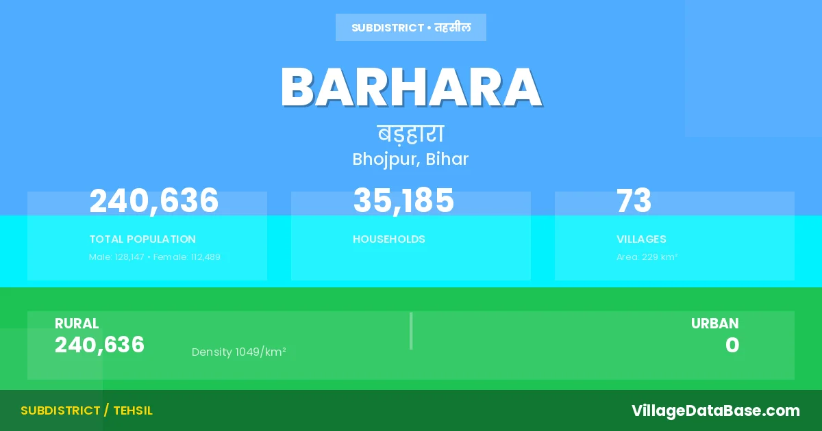 According to the 2011 census The total area of Barhara Subdivision is 229 km², with a population of 240636 people. The population density is 1,049 inhabitants per square kilometre, and there are approximately 35185 houses in the sub district.