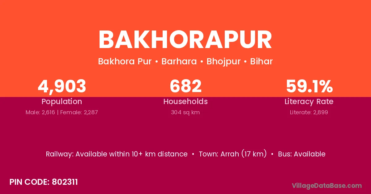 Arrah (17 km) is the nearest town to Bakhorapur village for major economic activities and is located approximately 17 km away.