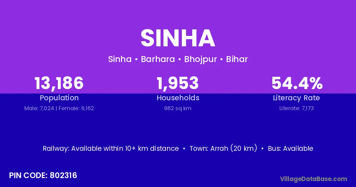 Arrah (20 km) is the nearest town to Sinha village for major economic activities and is located approximately 20 km away.