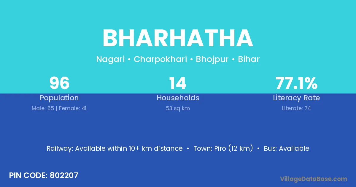 Piro (12 km) is the nearest town to Bharhatha village for major economic activities and is located approximately 12 km away.
