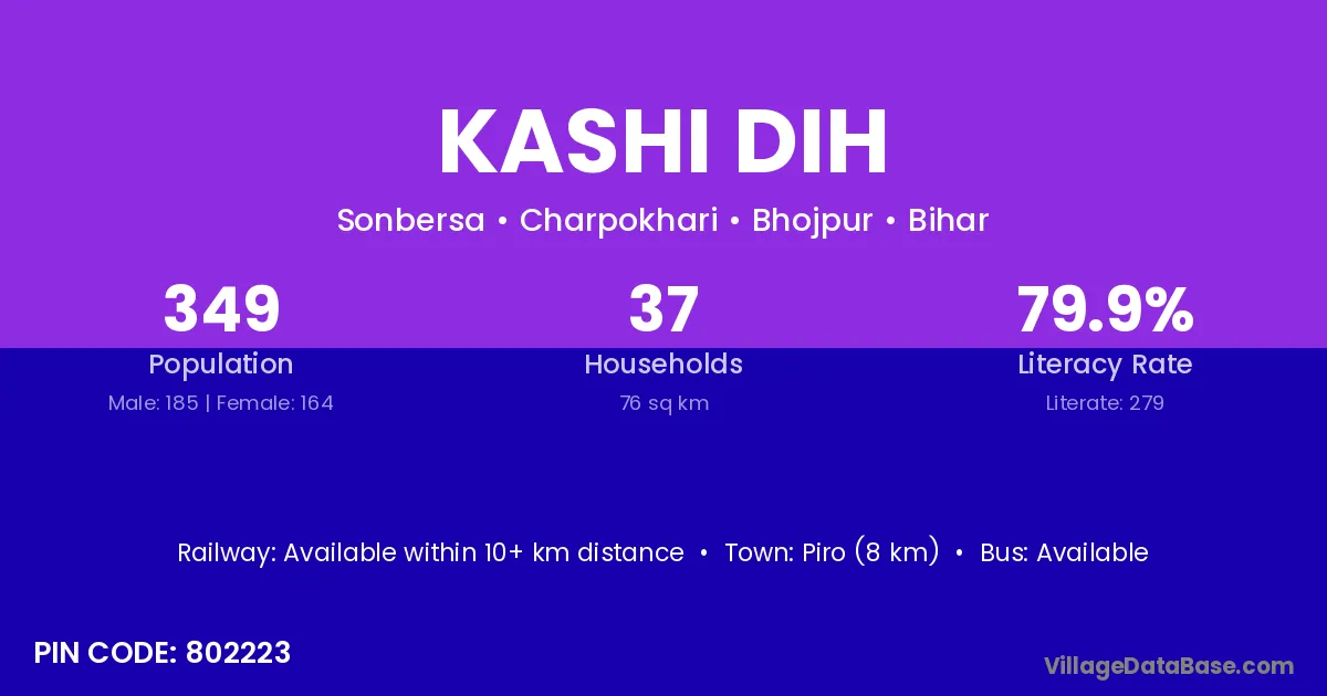 Piro (8 km) is the nearest town to Kashi Dih village for major economic activities and is located approximately 8 km away.