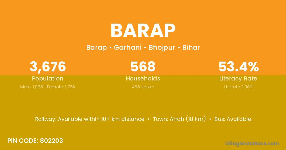 Arrah (18 km) is the nearest town to Barap village for major economic activities and is located approximately 18 km away.