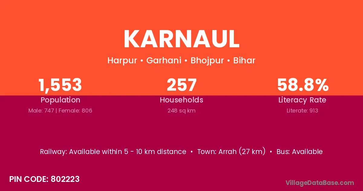 Arrah (27 km) is the nearest town to Karnaul village for major economic activities and is located approximately 27 km away.