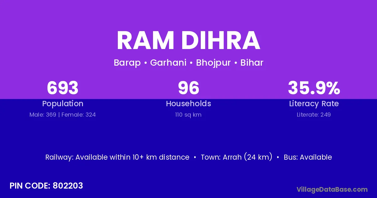 Arrah (24 km) is the nearest town to Ram Dihra village for major economic activities and is located approximately 24 km away.