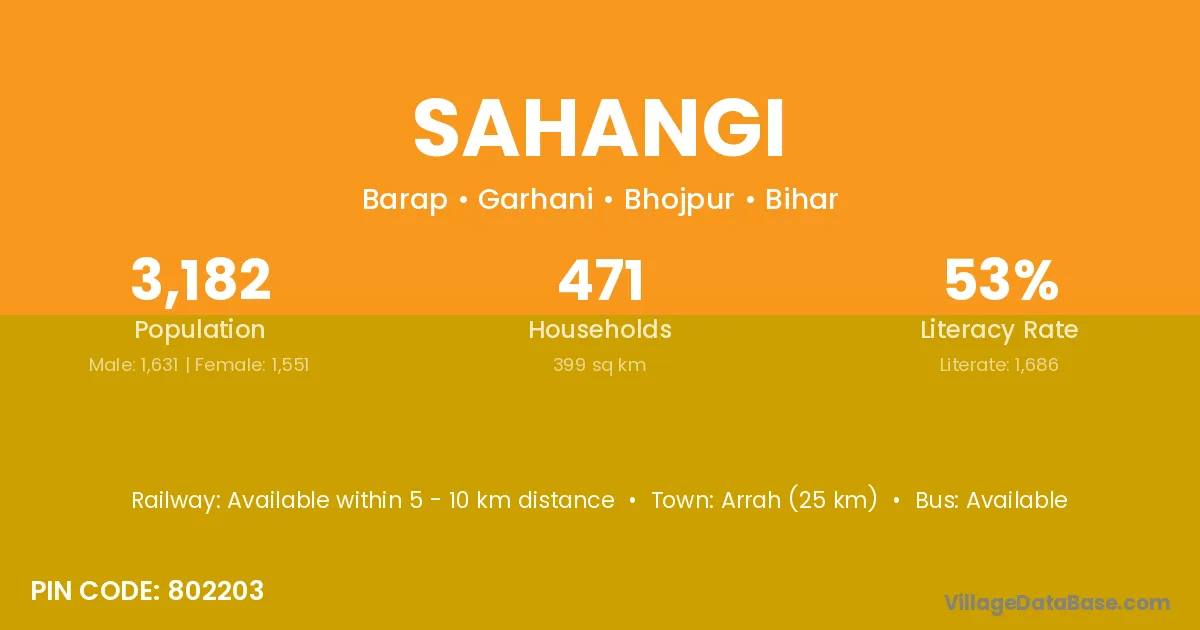Arrah (25 km) is the nearest town to Sahangi village for major economic activities and is located approximately 25 km away.