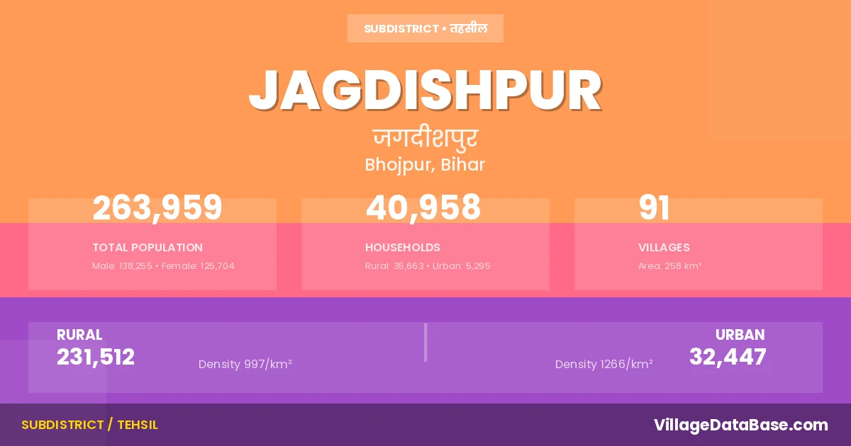 According to the 2011 census The total area of Jagdishpur Subdivision is 258 km², with a population of 263959 people. The population density is 1,024 inhabitants per square kilometre, and there are approximately 40958 houses in the sub district.