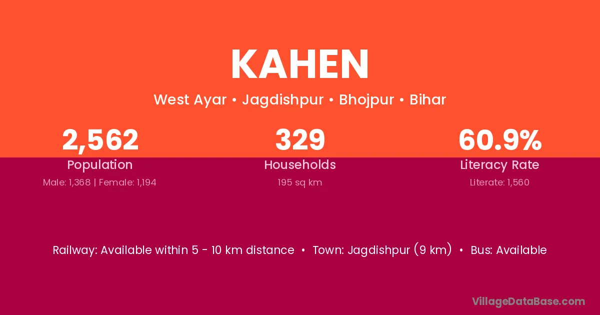 Jagdishpur (9 km) is the nearest town to Kahen village for major economic activities and is located approximately 9 km away.