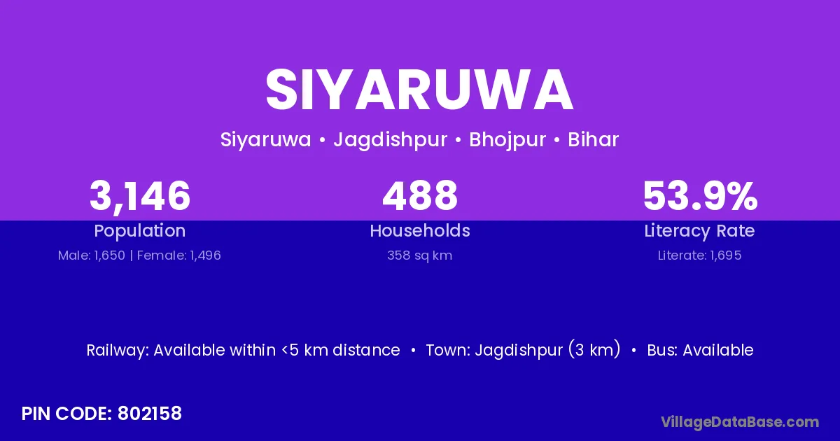 Jagdishpur (3 km) is the nearest town to Siyaruwa village for major economic activities and is located approximately 3 km away.