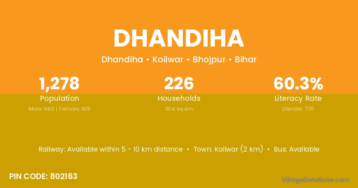 Koilwar (2 km) is the nearest town to Dhandiha village for major economic activities and is located approximately 2 km away.