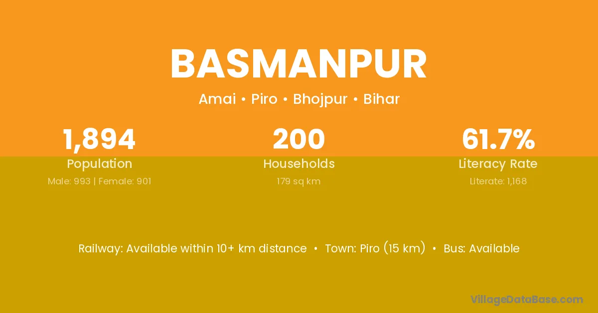 Piro (15 km) is the nearest town to Basmanpur village for major economic activities and is located approximately 15 km away.