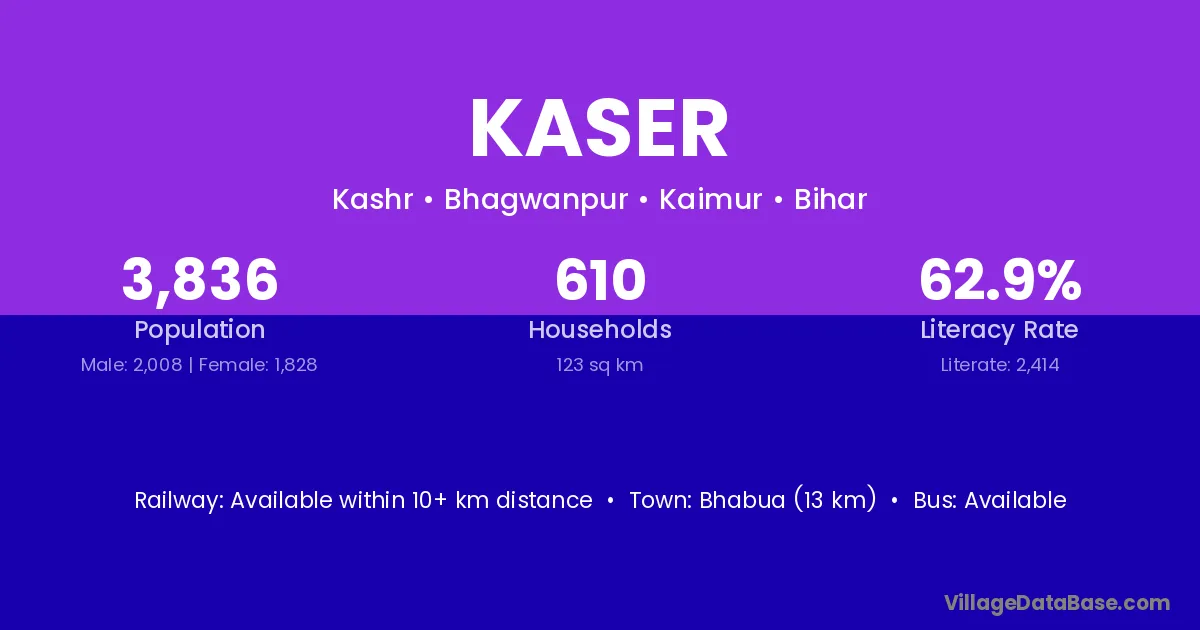 The literacy rate of Kaser village is 52.13%. Male literacy stands at 62.23% and female literacy at 42.08%.
