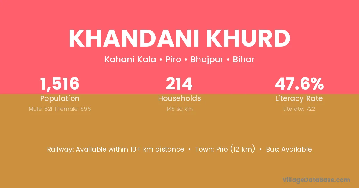 Piro (12 km) is the nearest town to Khandani Khurd village for major economic activities and is located approximately 12 km away.