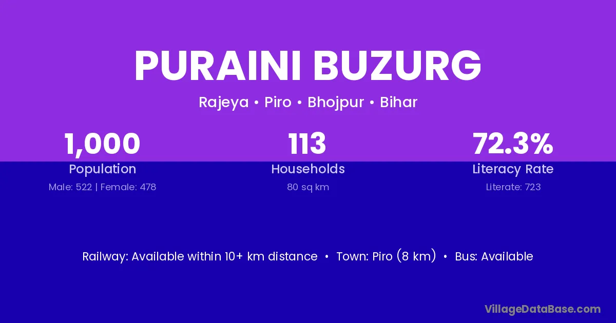 Piro (8 km) is the nearest town to Puraini Buzurg village for major economic activities and is located approximately 8 km away.