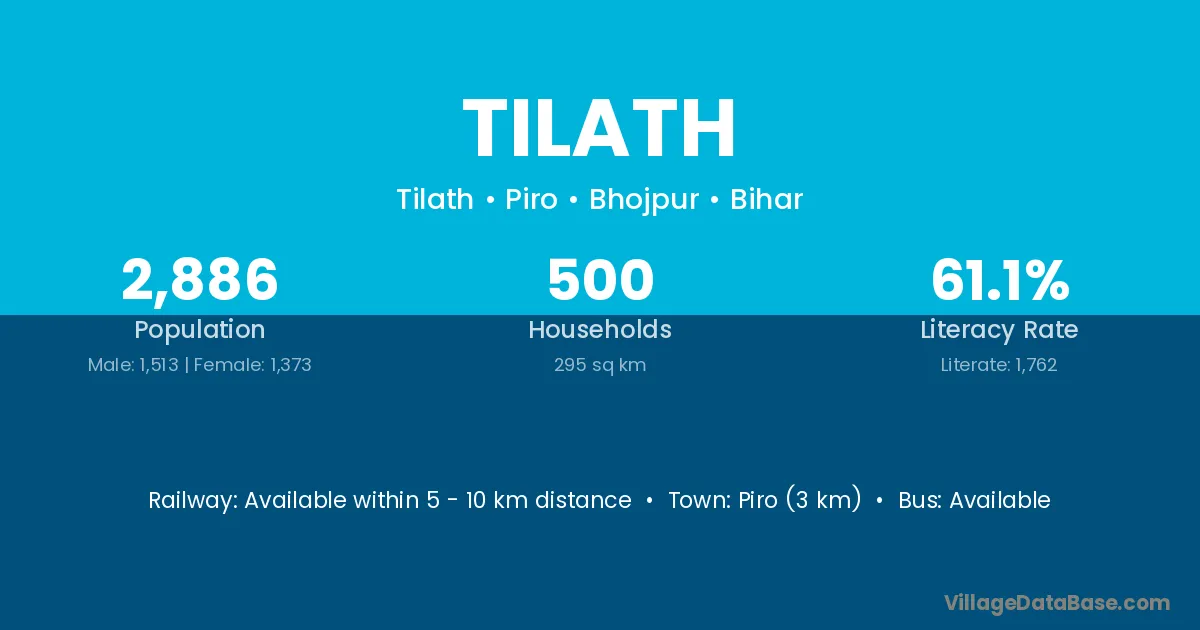 Piro (3 km) is the nearest town to Tilath village for major economic activities and is located approximately 3 km away.