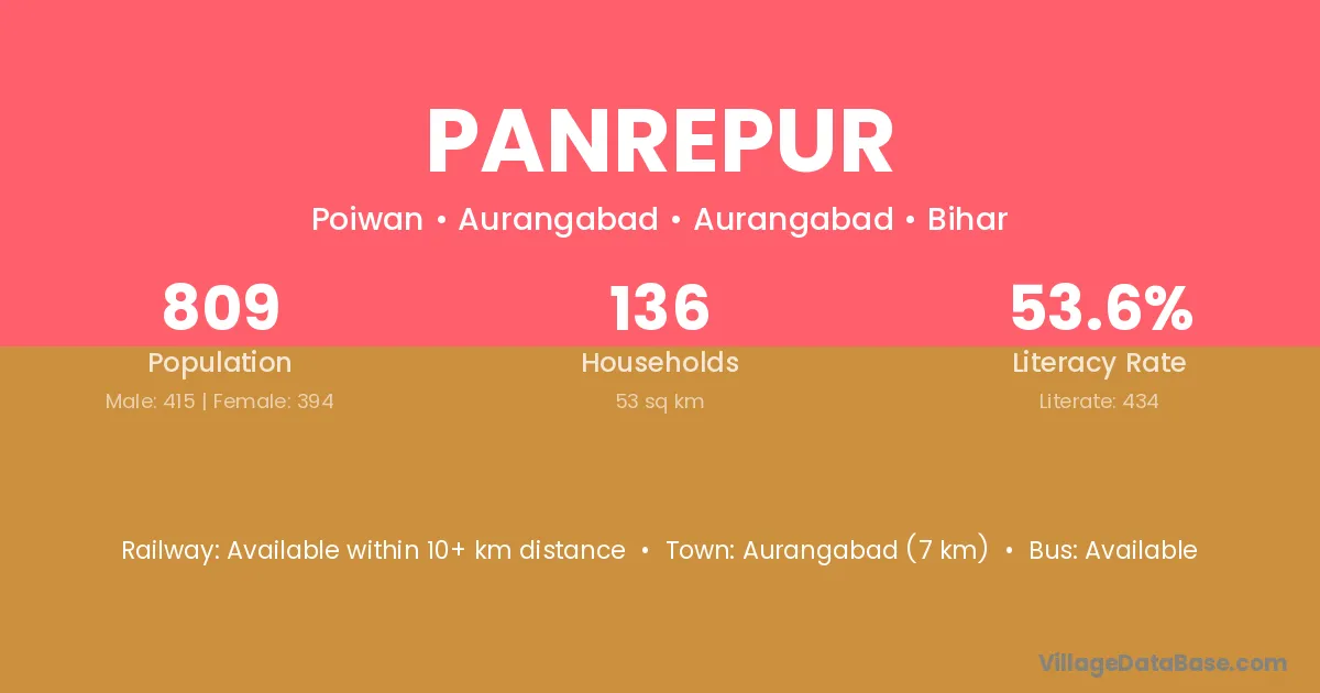 Arrah (30 km) is the nearest town to Panrepur village for major economic activities and is located approximately 30 km away.
