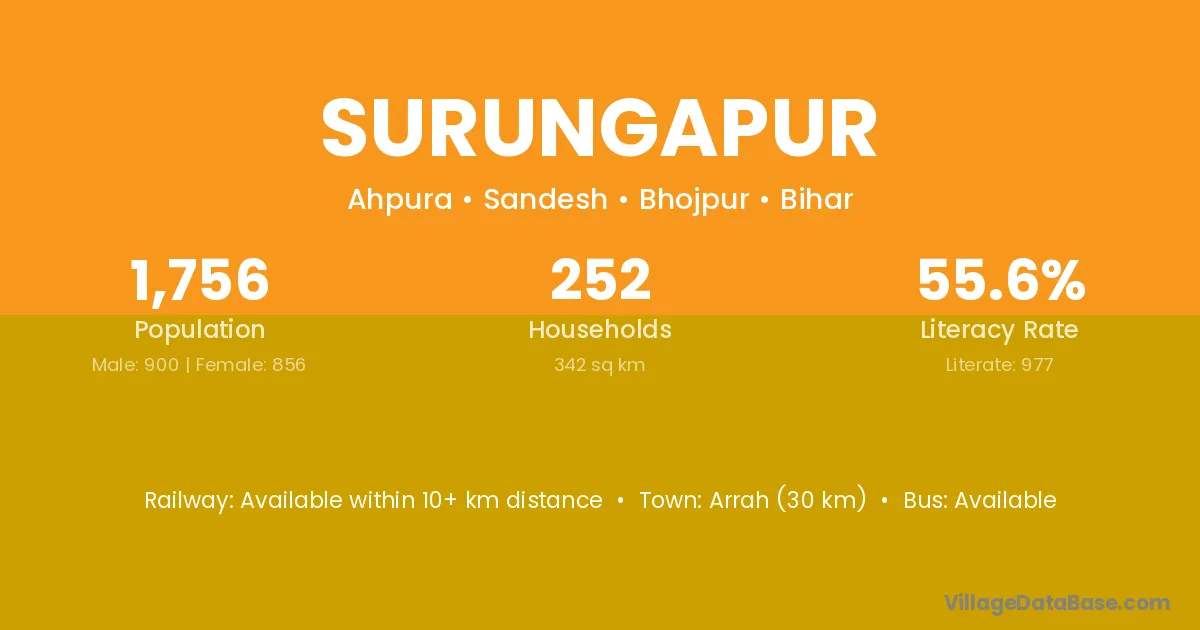 Arrah (30 km) is the nearest town to Surungapur village for major economic activities and is located approximately 30 km away.