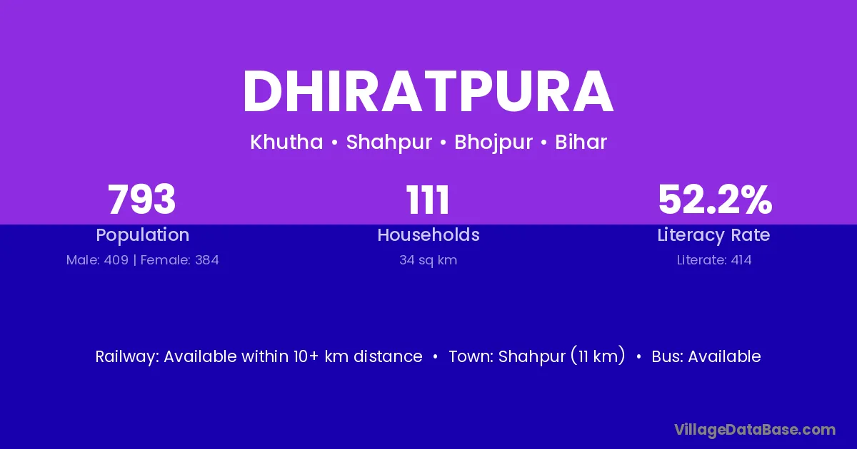The literacy rate of Dhiratpura village is 52.21%. Male literacy stands at 65.53% and female literacy at 38.02%.