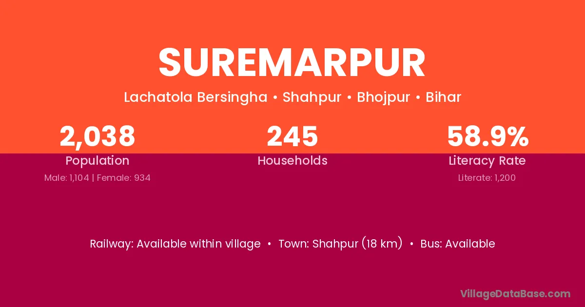Suremarpur village has a total population of 2,038 people, of which 1,104 are males and 934 are females.
