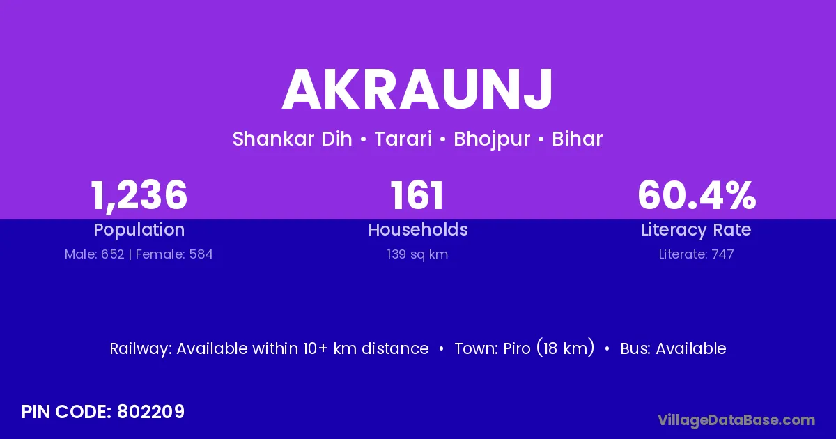 Piro (18 km) is the nearest town to Akraunj village for major economic activities and is located approximately 18 km away.