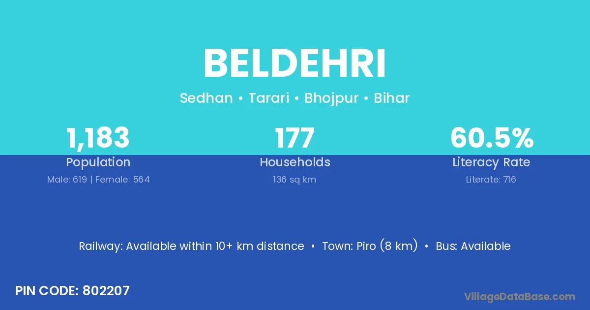 Piro (8 km) is the nearest town to Beldehri village for major economic activities and is located approximately 8 km away.