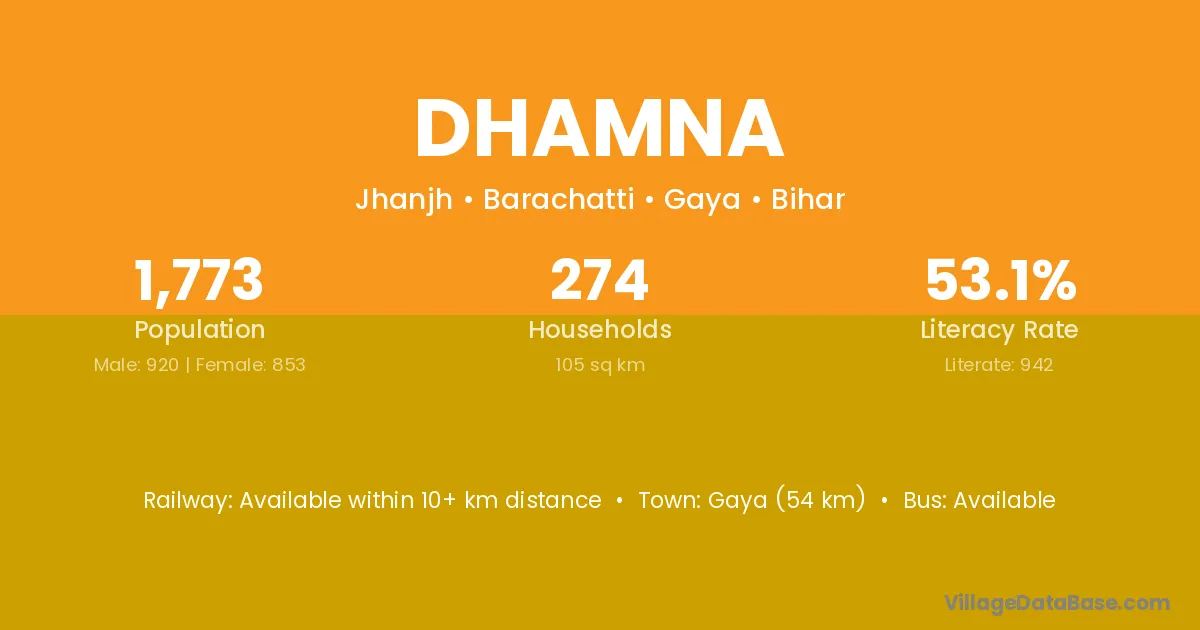 Piro (16 km) is the nearest town to Dhamna village for major economic activities and is located approximately 16 km away.