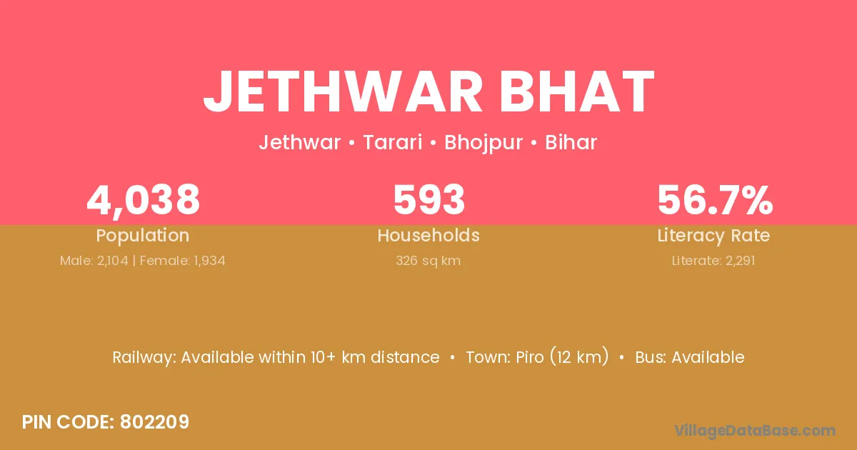 Piro (12 km) is the nearest town to Jethwar Bhat village for major economic activities and is located approximately 12 km away.