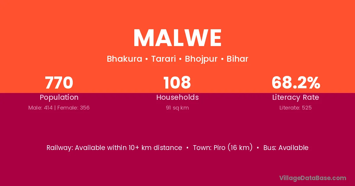 Piro (16 km) is the nearest town to Malwe village for major economic activities and is located approximately 16 km away.