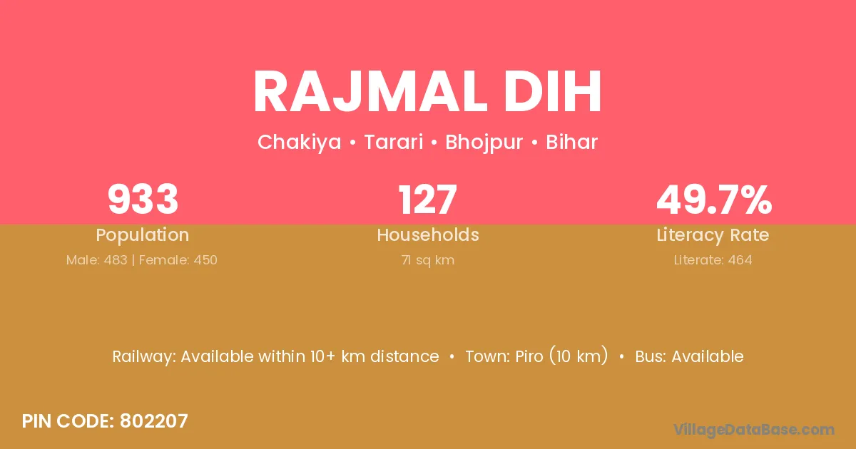 Piro (10 km) is the nearest town to Rajmal Dih village for major economic activities and is located approximately 10 km away.