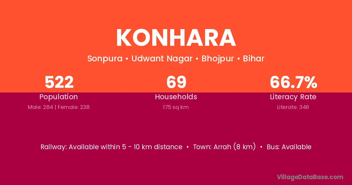 Arrah (8 km) is the nearest town to Konhara village for major economic activities and is located approximately 8 km away.