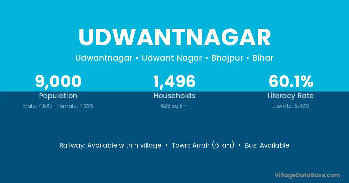 Arrah (6 km) is the nearest town to Udwantnagar village for major economic activities and is located approximately 6 km away.