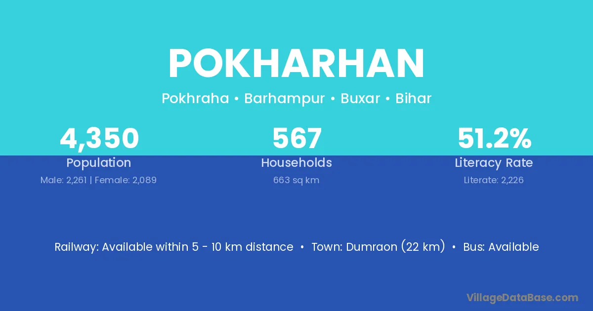 Dumraon (22 km) is the nearest town to Pokharhan village for major economic activities and is located approximately 22 km away.