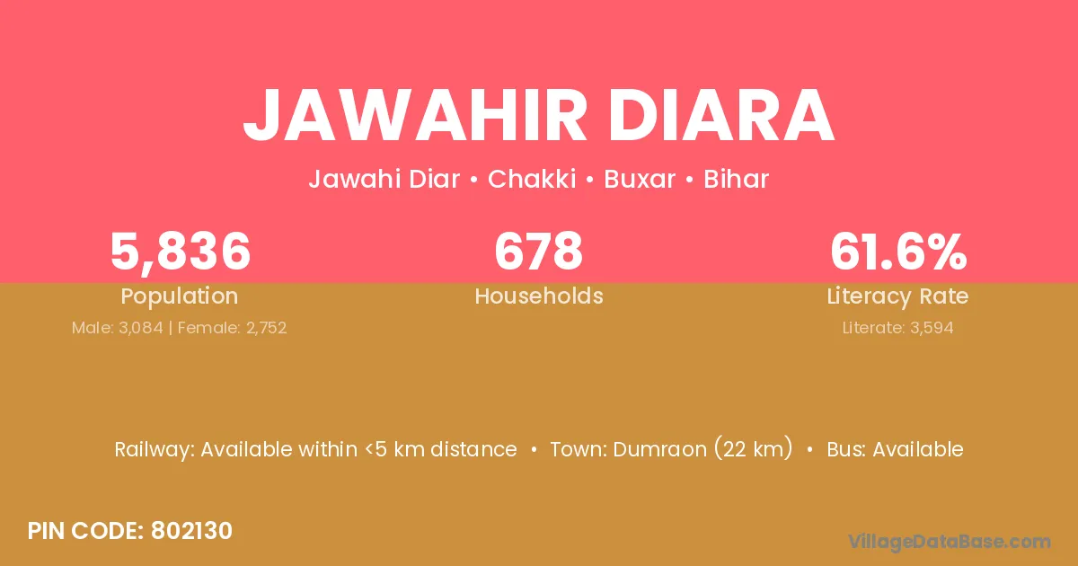 Dumraon (22 km) is the nearest town to Jawahir Diara village for major economic activities and is located approximately 22 km away.
