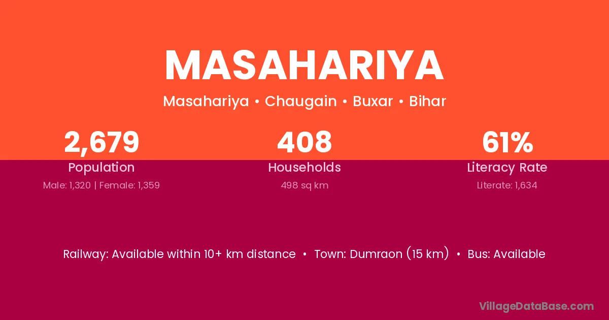 Dumraon (15 km) is the nearest town to Masahariya village for major economic activities and is located approximately 15 km away.