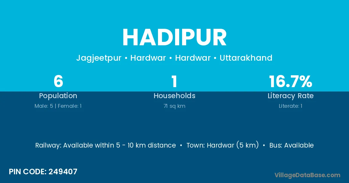 The literacy rate of Hadipur village is 72.85%. Male literacy stands at 82.01% and female literacy at 62.62%.
