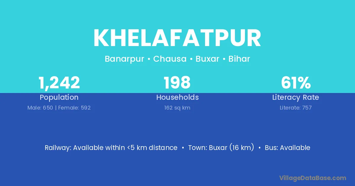 Buxar (16 km) is the nearest town to Khelafatpur village for major economic activities and is located approximately 16 km away.